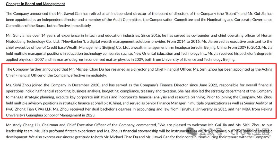 公开资料显示,杜超毕业于香港大学,获经济学及金融学学士学位,拥有近20年投资银行及企业战略、财务管理经验。杜超在德意志银行工作的十年间牵头完成数十个境外上市融资和跨境并购项目,在新经济、互联网、教育和高端制造业等多个行业积累丰富经验。其后加入一起教育科技集团任职CFO,负责该公司的财务、战略、商业分析、投资者关系及法务工作,并带领该公司完成美国纳斯达克上市。