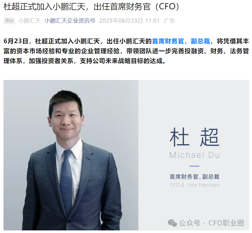 2025年6月23日,小鹏汇天官宣,杜超正式加入小鹏汇天,出任小鹏汇天的首席财务官、副总裁。