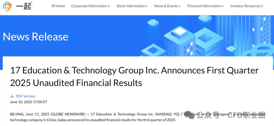 2025年6月11日,一起教育科技集团有限公司17 Education & Technology Group Inc.(NASDAQ:YQ)公布了2025年第一季度未经审计的财务业绩。一起教育还同时公布了首席财务官变更信息。公告显示,杜超已辞去董事兼首席财务官职务,周思诗被任命为公司代理首席财务官,该任命立即生效。