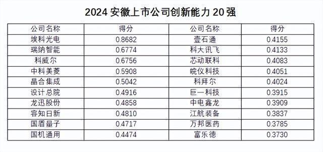 从创新能力排名看,埃科光电、瑞纳智能、科威尔位列前三,安徽上市公司创新能力稳步提升,打头阵走前列未歇。