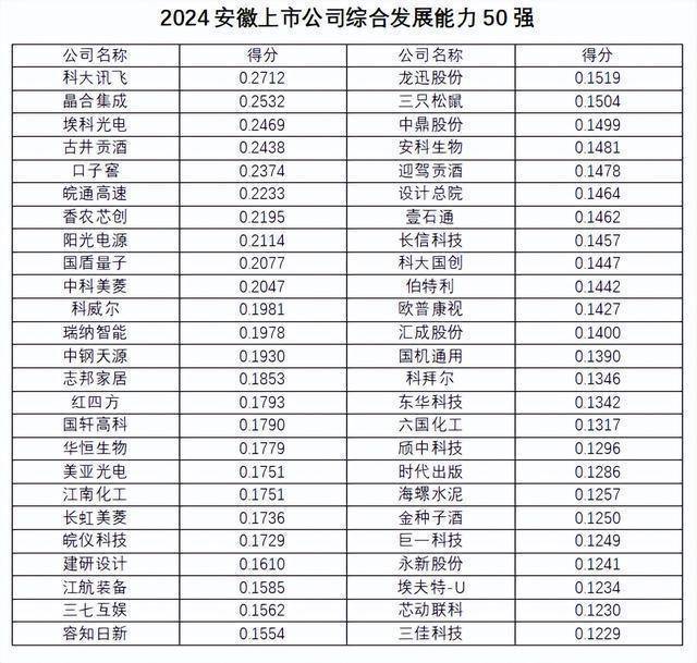 从综合发展能力排名看,科大讯飞凭借较强优势列为榜首,晶合集成、埃科光电表现突出;从综合业绩发展排名看,古井贡酒、阳光电源、迎驾贡酒位列前三。